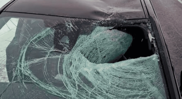 Samochód został poważnie uszkodzony – zniszczona szyba, zdeformowany dach i wnętrze pełne odłamków szkła pokazują, jak niewiele brakowało do tragedii.